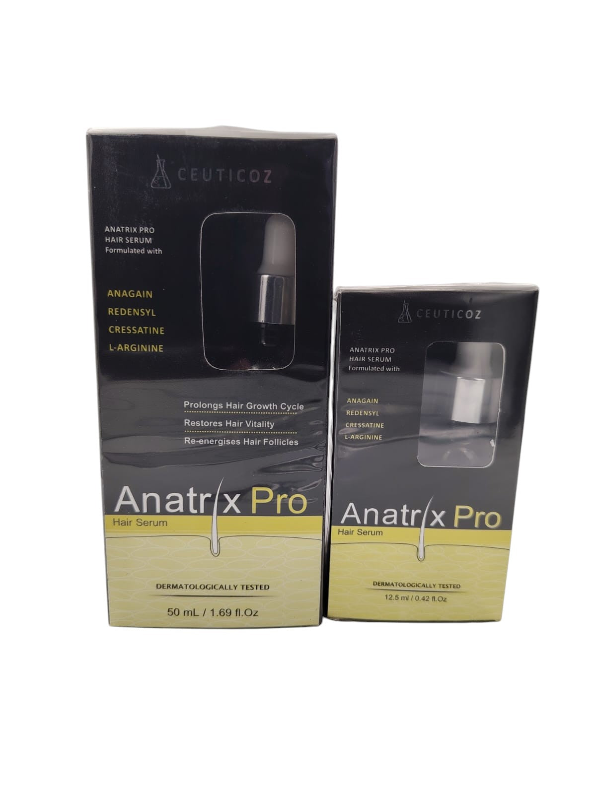 Anatrix Pro Hair Serum is an advanced hair growth solution designed to stimulate hair growth through multiple pathways providing thicker, healthier and more luscious hair. Its synergistic blend of active ingredients targets various aspects of hair growth ensuring comprehensive stimulation. With dormant follicle stimulators and potent DHT (dihydrotestosterone) blockers, it not only promotes hair growth but also prevents hair thinning, miniaturization and balding. It is designed to be lightweight and non-greasy for effortless application.